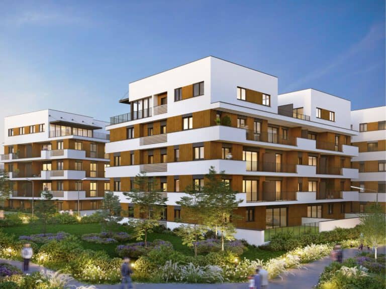 External landscaping designed by a landscape architect, combining greenery and decorative elements for residents’ wellbeing.